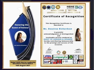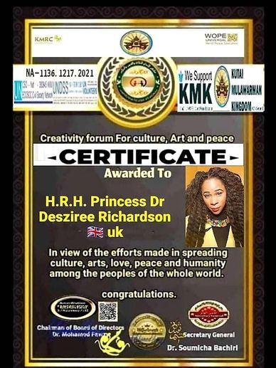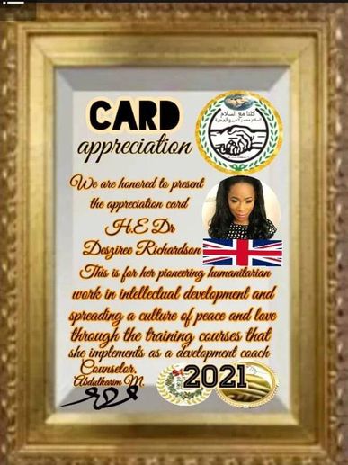 H.E. Dr Desziree Richardson is an International, Inspirational and Motivational Speaker, Vibratory Voice Healer, Branding Iconic Expert, Women Empowerment Advocate, Entrepreneur, Leader and Humanitarian. Desziree feels a genuine desire and devotion to the well-being and welfare of her fellow human beings and appreciates being a service to others. Her work is to reach a broader audience to impact the lives of every human existence. She believes it is one of her sole purposes to share her experience and wisdom to help empower positive changes in many people worldwide. She is the UK Representative for the Birland State government, UK ambassador to United States Presidential Services, also an International Multicultural Distinguished Honorary Advisor for FOWCAAS.org Singapore, and Ambassador for International Forum for Creativity and Humanity, the Kingdom of Morocco and Safeguarding Children Sava Samiti Agra Uttar Pradesh, India.